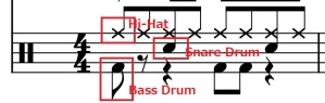 シンコペーションの箇所にバスドラム(Bass drum)が入っていることを意識してみてください。