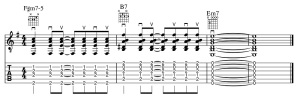 KeyがAmの場合、Bm7-5⇒E7⇒Am7のコード進行で用いられます。