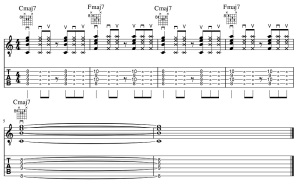 続いて、8フレットのFmaj7に合わせたポジションでのコード展開です。