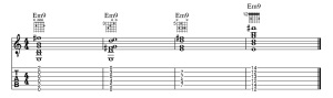 Em9はAm9と同様、ギターの開放弦が使えるため、開放弦を含めたコードフォームも記しています。