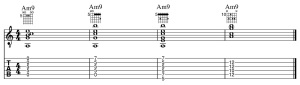 Am9のほかにもAm7(9)で表記されるケースもあります。