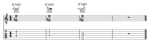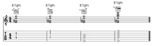 E7(♭9)はE(1st)とG#(3rd)、B(5th)とD(7th)とF(♭9th)が構成音となります。