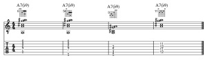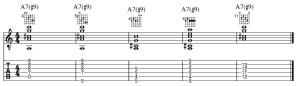 A7(♭9)であれば、A(1st)とC#(3rd)、E(5th)とG(7th)とA#(♭9th)が構成音となります。